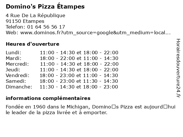 2 A Allo Rapido Pizza (Distance: 0,25 km) 4 Rue De La Tannerie, 91150 Etampes allo, pizza, rapido, restaurants 3 Pizza La Toscane (Distance: 8,33 km) Monsieur Christophe Bouville, 34120 Pezenas bouville, christophe, pizza, restaurants, toscane 6 Baïla Pizza (Distance: 15,48 km) . Rue Louise de Vilmorin, 91630 Avrainville baïla, italien, pizza, pizzeria |