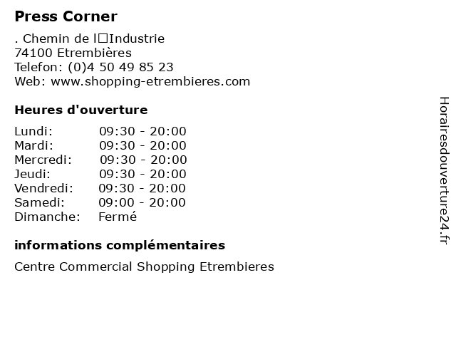 1 Press Corner (Distance: 2,87 km) 21 Chemin de l’Industrie, 74100 Etrembières corner, jeux, press, presse 2 Nature & Découvertes - Corner (Distance: 0,54 km) 14 Rue de la Résistance, 74100 Annemasse corner, divers, décoration, découvertes, habitat, magasin, maisons, nature 3 Sushi Shop Corner (Distance: 1,70 km) 3 Rue Albert Henon, 74100 Ville-la-Grand corner, japonais, makis, poisson, shop, sushi 5 Sarl Press'Corner (Distance: 2,86 km) Centre Commercial Shopping Etr, 74100 Etrembieres corner, papeteries, press 6 Relais Colis® / PRESSING PRESS'UNIC (Distance: 6,87 km) 196 Grande Rue, 74930 Reignier-Ésery colis, colis®, press'unic, pressing, relais, services postaux et de livraison |
