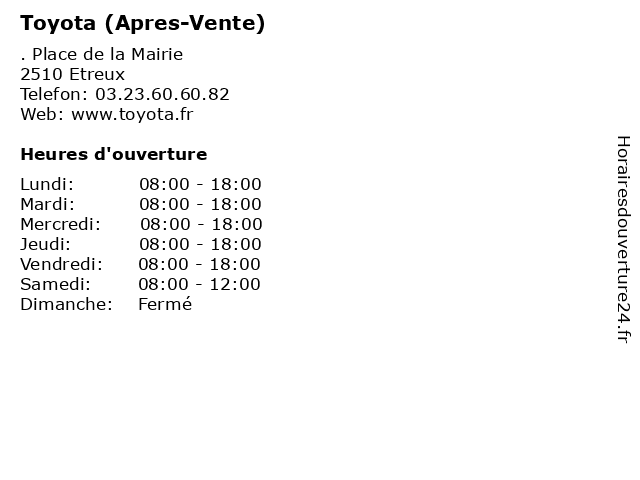 1 Toyota (Distance: 0,00 km) . Place de la Mairie, 02510 Etreux automobiles, concéssionnaire, garage, motos, toyota 2 Toyota DJB Bourg-en-Bresse (Distance: 26,18 km) 647 Route Départementale 1075, 01250 Montagnat atelier, automobile, bourg, bresse, concessionnaire, djb, en, garage, neuve, occasion, reparation, toyota, vente 3 Toyota AT Automobiles (Atelier) (Distance: 34,20 km) . Rue Blaise Pascal, 39000 Lons Le Saunier at, atelier, automobiles, garage, motos - concessionnaire, toyota 4 Toyota AT Automobiles (Distance: 34,20 km) . Rue Blaise Pascal, 39000 Lons Le Saunier at, atelier, automobiles, garage, motos - concessionnaire, toyota 5 Citroën - Ets Carrel - Après Vente (Distance: 44,64 km) 62 Avenue Saint Exupery, 01200 Bellegarde-sur-Valserine apres, après, carrel, citroën, est, ets, services, vente, véhicules 6 PRO&Cie - Ent. MDH Services (Distance: 48,18 km) 704 Avenue Léon Blum, 01500 Ambérieu-en-Bugey antenne, antennes tnt satellite, ecran plat, electromenager, ent., mdh, pro&cie, reparation electromenager, reparation vente tv, sav, sav integre au magasin, service apres vente, services |