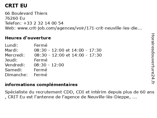 1 CRIT NEUVILLE-LES-DIEPPE (Distance: 26,23 km) 25 Avenue de la Libération, 76370 Dieppe crit, dieppe, les, neuville |