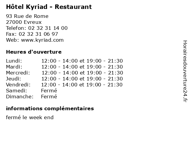 | Mardi | 12:00-14:00 et 19:00-21:30 |