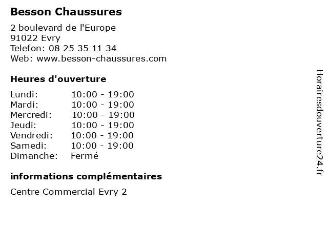 1 Besson Chaussures (Distance: 4,77 km) . Rue de la Plaine, 91100 Villabe besson, chaussures, enfants, homme, mode femme 2 Besson Chaussures (Distance: 5,76 km) 17 Avenue de la Croix Blanche, 91700 Sainte-Geneviève-des-Bois besson, bébé, chaussures, entretien, femme, homme, maroquinerie 3 Besson Chaussures (Distance: 9,85 km) 156 Avenue François Mitterrand, 91200 Athis Mons besson, chaussures, enfants, homme, mode femme 4 Besson Chaussures (Distance: 15,30 km) . Chemin de Briis, 91141 Villebon sur Yvette accessoires, besson, chaussures, maroquinerie, mode 5 Besson Chaussures (Distance: 15,74 km) 4-6 Allée des Jachères, 94263 Fresnes accessoires, besson, chaussure, chaussures, enfants, femmes, hommes, mode 6 Besson Chaussures (Distance: 16,08 km) . Avenue de la Convention, 94380 Bonneuil Sur Marne besson, chaussures, enfants, homme, mode femme |