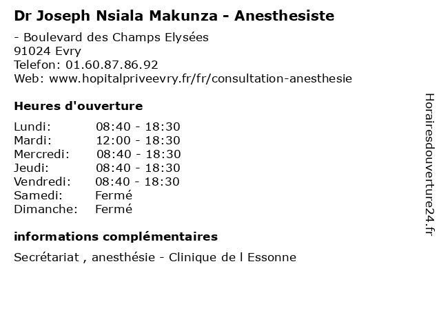 1 Dr Adèle Kanaan - Anesthesiste (Distance: 0,00 km) - Boulevard des Champs Elysées, 91024 Evry adèle, anesthesiste, consultation, docteur, dr, kanaan, med, médecin, médecine, traitement 2 Dr Edouard Kenga Lemba - Anesthesiste (Distance: 0,00 km) - Boulevard des Champs Elysées, 91024 Evry anesthesiste, consultation, docteur, dr, edouard, kenga, lemba, med, médecin, médecine, traitement 3 Dr Mohand Sadek Oukaour - Anesthesiste (Distance: 0,00 km) - Boulevard des Champs Elysées, 91024 Evry anesthesiste, consultation, docteur, dr, med, mohand, médecin, médecine, oukaour, sadek, traitement 4 Maître Joseph Benaim - Avocat (Distance: 0,67 km) 10 Allée des Champs Elysées, 91080 Evry-Courcouronnes avocat, avocats, benaim, civils, droits, joseph, juridiques, maître 6 Maître François-Joseph Varin - Avocat (Distance: 6,75 km) 91 route de Corbeil, 91390 Morsang-sur-Orge avocat, avocats, civils, droits, françois, joseph, juridiques, maître, varin |