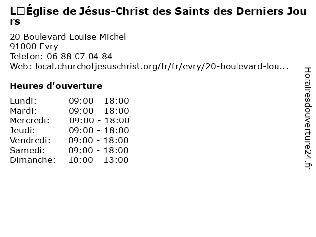 1 L’Église de Jésus-Christ des Saints des Derniers Jours (Distance: 18,23 km) 10 Rue De Dammarie, 77000 Melun christ, de, derniers, des, jours, jésus, l’église, organisation religieuse, saints 2 ERDF ARE Ile de France Est ( Infos jours EJP ) (Distance: 10,61 km) 60 Rue Pierre Brossolette, 91220 Brétigny-sur-Orge agences, are, de, ejp, electricite, energie, erdf, est, france, ile, infos, jours, services 3 Initiative Essonne (Distance: 1,15 km) 2 Cours Monseigneur Roméro, 91000 Évry aide, création, entreprise, essonne, initiative, organisation 4 Secours Catholique (Distance: 2,89 km) 4 Domaine de Guerville, 91450 Soisy-sur-Seine accueil, association, catholique, organisation, secours 5 Hapik (Distance: 7,07 km) 4 Rue des Mares, 91700 Sainte Geneviève des Bois enfants, escalade, et, fériés, fêtes, hapik, jeux, jours, loisirs, murs, salle, scolaires, vacances 6 Caquineau Expertise (Distance: 9,53 km) 29 Rue des Rosières, 91240 St Michel sur Orge administratifs, caquineau, comptables, expertise, fiscaux, juridiques, organisation, sociaux |