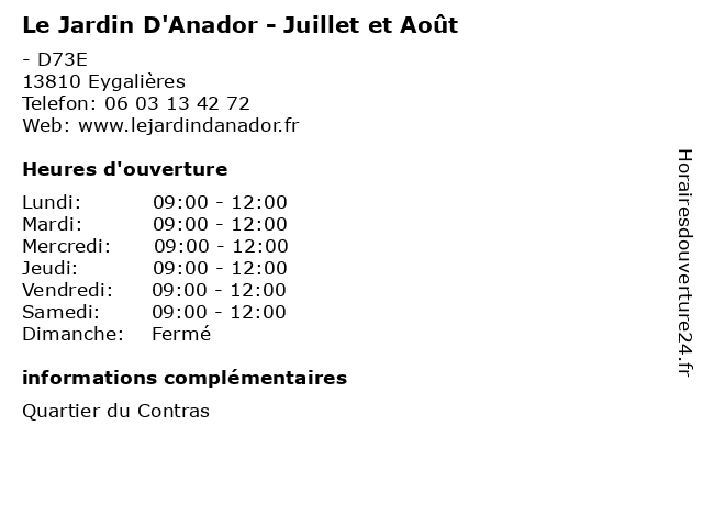 1 Le Jardin D'Anador (Distance: 0,00 km) - D73E, 13810 Eygalières d'anador, fleurs, jardin, le, plantes, potagers, végétal 2 Camping Le Pilon d'Agel (Juillet et Août) (Distance: 7,71 km) 250 chemin du Pilon d'Agel, 13550 Noves août, camping, caravaning, d'agel, et, juillet, le, loisirs, pilon, réception, tourisme, vacances 3 Provence Matériaux - Juillet et Août (Distance: 13,16 km) - Route Nationale 7, 13560 Sénas août, armature, construction, et, façade, isolation, juillet, matériaux, provence, vente 4 Relais Colis® / LE JARDIN DE MAI-LY (Distance: 13,56 km) 9 Avenue Pasteur, 13890 Mouries colis, colis®, de, jardin, le, ly, mai, relais, services postaux et de livraison 5 Château des Baux de Provence - Juillet et août (Distance: 14,50 km) - Château des Baux de Provence, 13520 Les Baux-de-Provence ancien, août, art, baux, chateau, château, de, des, et, exposition, histoire, juillet, livre, monument, musee, musée, office, provence, savoir, tourisme 6 Provence Matériaux - Juillet et Août (Distance: 14,53 km) - Route de Saint Martin de Crau, 13890 Mouriès août, armature, construction, et, façade, isolation, juillet, matériaux, provence, vente |