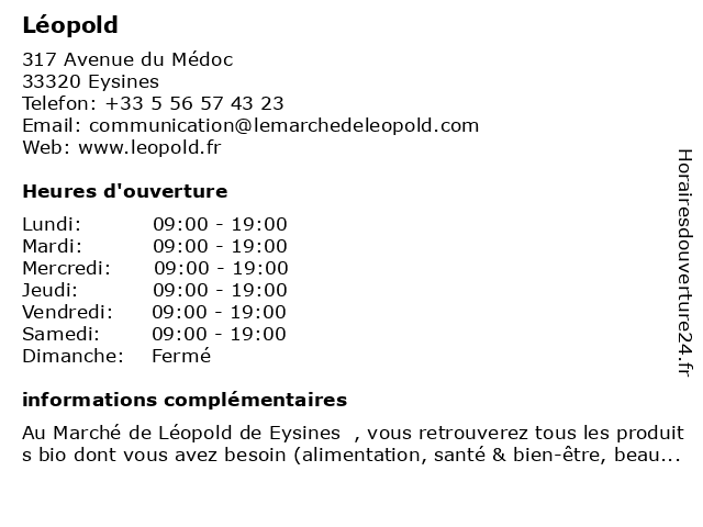 1 Le Marché de Léopold - Eysines (Distance: 0,00 km) 317 Avenue du Médoc, 33320 Eysines de, eysines, le, les comptoirs de la bio, léopold, magasin bio, magasin bio 33320, magasin bio eysines, marché 2 Le Marché de Léopold Le Pian-Médoc (Distance: 7,39 km) Route de Pauillac, 33290 Le Pian-Médoc de, le, léopold, marché, médoc, pian 3 Brasserie Léopold (Distance: 9,02 km) 67 Cours de l'Intendance, 33000 Bordeaux apéritifs, boissons, brasserie, léopold 4 Léopold Martin-Calvet - Ostéopathe (Distance: 12,23 km) 18 Avenue Gustave Eiffel, 33600 Pessac calvet, léopold, martin, ostéo, ostéopathe, ostéopathes, soins 5 Le Marché de Léopold - Villenave d'Ornon (Distance: 15,80 km) 64 Route de Léognan, 33140 Villenave-d'Ornon cosmétique bio, d'ornon, de, le, les comptoirs de la bio, léopold, magasin bio, magasin bio 33, magasin bio 33140, magasin bio villenave-d'ornon, magasin bio à proximité, marché, villenave, vrac 6 Le Marché de Léopold (Distance: 15,81 km) 64 Route de Léognan, 33140 Villenave-d'Ornon de, le, léopold, marché |