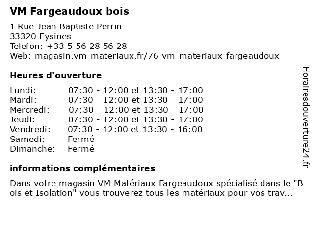 1 VM Matériaux Exelpan (Distance: 0,00 km) 1 Rue Jean Baptiste Perrin, 33320 Eysines exelpan, matériaux, vm 3 Vm Materiaux (Distance: 1,46 km) 252 Rue Jean-Mermoz, 33326 Eysinex constructives, equipements, materiaux, services, vm 4 L'Autre Petit Bois (Distance: 7,41 km) 12 Place du Parlement, 33000 Bordeaux bars, bois, business, l'autre, liquors, petit 5 Médiathèque du Bois fleuri (Distance: 10,68 km) . rue Lavergne, 33310 Lormont bd, bois, du, fleuri, livres, livres en gros caractères, médiathèque, revues 6 Vm Materiaux (Distance: 11,39 km) . Allée Saint Joseph, 33140 Villenave D'Ornon constructives, equipements, materiaux, services, vm |