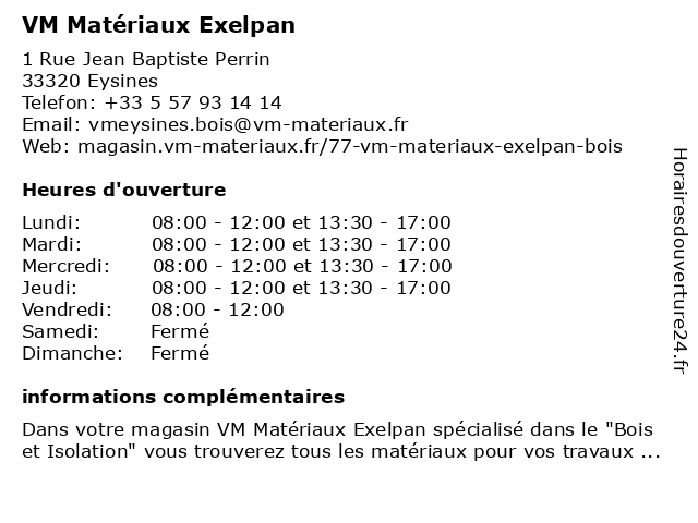1 VM Fargeaudoux bois (Distance: 0,00 km) 1 Rue Jean Baptiste Perrin, 33320 Eysines bois, fargeaudoux, vm 3 Vm Materiaux (Distance: 1,46 km) 252 Rue Jean-Mermoz, 33326 Eysinex constructives, equipements, materiaux, services, vm 4 Chausson Matériaux (Distance: 2,47 km) 15 Avenue Maurice Levy, 33700 Merignac chausson, isolation, matériaux, platrerie 5 Chausson Matériaux (Distance: 6,52 km) 350 Boulevard Alfred Daney, 33300 Bordeaux chausson, isolation, matériaux, platrerie 6 Vm Materiaux (Distance: 11,40 km) . Allée Saint Joseph, 33140 Villenave D'Ornon constructives, equipements, materiaux, services, vm |