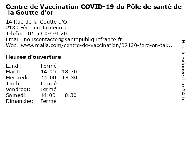 1 Centre de Vaccination COVID-19 - Salle des fêtes (Distance: 17,11 km) 28 Rue de la Huchette, 51170 Fismes 19, centre, covid, covid 19, covid19, de, des, fêtes, médecin, médecine, médical, salle, test, vaccin, vaccination, vaccins 2 Dr Karim Belaid - Médecin du Sport-Santé (Distance: 17,45 km) 1 rue Christian Cabrol, 02400 Château-Thierry belaid, consultation, docteur, domicile, dr, dr.karim, du, en, générale, karim, médecin, médecine, santé, sport, visite 3 Centre de Vaccination COVID-19 du CH Château-Thierry (Distance: 17,82 km) n/a Route de Verdilly, 02400 Château-Thierry 19, centre, ch, château, covid, covid 19, covid19, de, du, médecin, médecine, médical, test, thierry, vaccin, vaccination, vaccins 4 Chambre d'agriculture de l'Aisne-Pôle agricole (Distance: 18,71 km) 11 rue Vallée, 02400 Château-Thierry agricole, agriculture biologique, chambre, cultures, d'agriculture, de, elevage, l'aisne, pôle 5 Pôle Emploi (Distance: 18,96 km) 56 avenue de la République, 02400 Château Thierry administration, agence, candidats, emploi, employeurs, offres, pole, public, publique, pôle, recherche, service, travail 6 Pharmacie des Archers (Distance: 0,53 km) 1 Place de la République, 02130 Fère-en-Tardenois archers, bas de contention, biostime, bébé, conseil, deambulateur, des, fauteuil roulant, fauteuil roulant location, fère-en-tardenois, gallia, lait, location, location lit medicalisé, novalac, orthopédie fère-en-tardenois, pharmacie, pharmacie ouverte le dimanche fère-en-tardenois, rehausseur toilette, test, tire-lait, veterinaire |