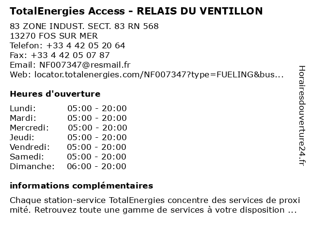 1 TotalEnergies Access - RELAIS FOS SUR MER (Distance: 0,05 km) 83 ZI - SECTEUR 83 - RN 568, 13270 FOS SUR MER access, fos, gas station, mer, relais, station service, sur, tankstelle, total, totalenergies 2 TotalEnergies - KEOS ISTRES BY AUTOSPHERE (Distance: 7,01 km) 22 Avenue Félix Gouin, 13800 Istres autosphere, by, gas station, istres, keos, station service, tankstelle, total, totalenergies 3 TotalEnergies - RELAIS PONT DU ROY (Distance: 8,06 km) N568, 13110 Port-de-Bouc du, gas station, pont, relais, roy, station service, tankstelle, total, totalenergies 4 TotalEnergies Access - RELAIS CANTO PERDRIX (Distance: 13,26 km) Avenue Francis Turcan, 13500 Martigues access, canto, gas station, perdrix, relais, station service, tankstelle, total, totalenergies 5 TotalEnergies - RELAIS DE CARONTE (Distance: 13,42 km) 19 ROUTE DU PORT DE LAVERA, 13500 MARTIGUES caronte, de, gas station, relais, station service, tankstelle, total, totalenergies 6 TotalEnergies Access - RELAIS MAS NEUF (Distance: 13,61 km) 2 . AVENUE DU SUD, 13140 MIRAMAS access, gas station, mas, neuf, relais, station service, tankstelle, total, totalenergies |
