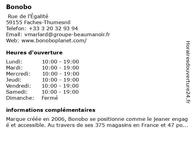 3 Bonobo (Distance: 11,26 km) Avenue du Grand Cottignies, 59290 Wasquehal blazer femme, bonobo, boutique vêtement, cardignan femme, chaussures femme, gilet femme, jean femme, jean homme, magasin vêtement, magasin vêtements mixte, manteau femme, manteau homme, mode femme, pull femme, pull homme, robe femme, sac femme, t-shirt femme, t-shirt homme, tailleur femme, top femme, vêtement femme, vêtement homme, vêtement mixte 4 Bonobo (Distance: 11,48 km) . Avenue du grand Cottignies, 59290 Wasquehal beaute, bonobo, cafe, chaussures, enfants, hommes, lingerie, mode femmes, restaurant, sport 6 Vib's (Cache Cache - Bonobo - Bréal) (Distance: 0,27 km) Rue de l'Égalité, 59155 Faches-Thumesnil bonobo, bréal, cache, vib's |
