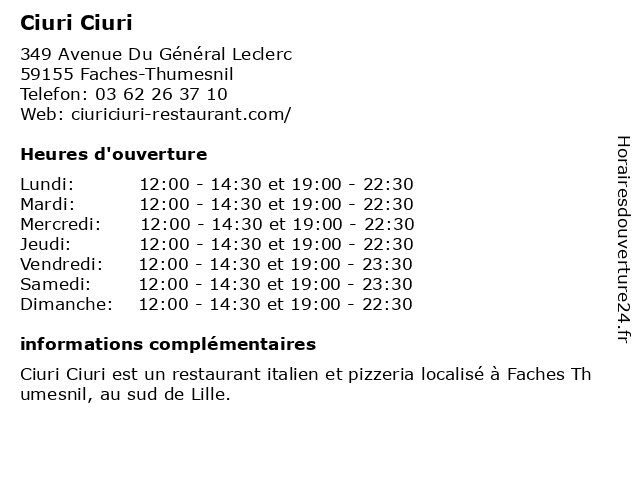 | Mardi | 12:00-14:30 et 19:00-22:30 |