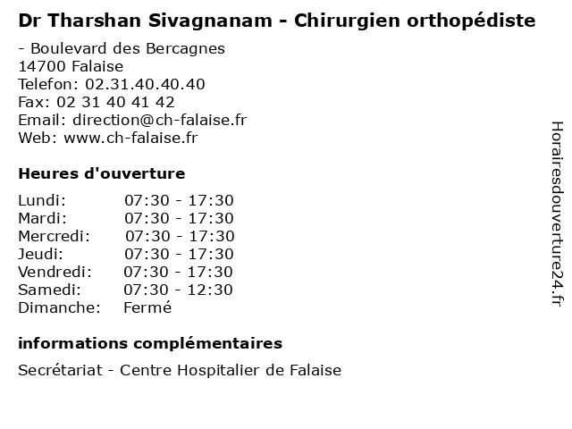 1 Dr Françoise Trottmann - Chirurgien orthopédiste (Distance: nan km) - Boulevard des Bercagnes, 14700 Falaise chirurgien, consultation, docteur, dr, françoise, med, médecin, médecine, orthopédiste, traitement, trottmann 2 Dr Marc Anzalone - Chirurgien orthopédiste (Distance: nan km) - Boulevard des Bercagnes, 14700 Falaise anzalone, chirurgien, consultation, docteur, dr, marc, med, médecin, médecine, orthopédiste, traitement 3 Dr Cédric Sabatier - Chirurgien orthopédiste (Distance: nan km) - Boulevard des Bercagnes, 14700 Falaise cedric, chirurgien, consultation, cédric, docteur, dr, med, médecin, médecine, orthopédiste, sabatier, traitement 4 Dr Tharshan Sivagnanam - Chirurgien orthopédiste (Distance: 42,59 km) 4 rue Roger Aini, 14100 Lisieux chirurgien, consultation, docteur, dr, med, médecin, médecine, orthopédiste, sivagnanam, tharshan, traitement 5 Dr Darshan Sivagnanam - Chirurgie Orthopédie et Traumatologique (Distance: 50,82 km) 23 Rue des Acres, 14500 Vire chirurgie, consultation, darshan, docteur, dr, et, med, médecin, médecine, orthopédie, secrétariat, sivagnanam, traitement, traumatologique 6 Dr Stephane Delforge - Chirurgien orthopédiste - secrétariat (Distance: 31,78 km) 10 Rue du Château d'Eau, 14000 Caen chirurgien, consultation, delforge, docteur, dr, med, médecin, médecine, orthopédiste, secrétariat, stephane, traitement |