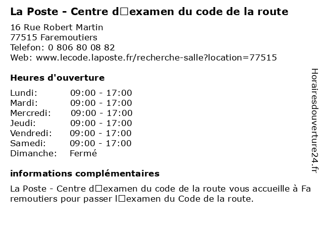 Termes de recherche pour La Poste - Centre d’examen du code de la route:poste, la, du, de, route, centre, code, d’examen, centre d'évaluation scolaire, école technique |