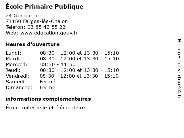 1 École Primaire Publique (Distance: 3,63 km) 3 Place Jules Ferry, 71880 Châtenoy-le-Royal cours, education, primaire, publique, services, école 2 École Primaire Publique (Distance: 4,57 km) 88 place François Droux, 71530 Virey-le-Grand cours, education, primaire, publique, services, école 3 École Primaire Publique (Distance: 5,11 km) 1 Rue Romain Rolland, 71100 Chalon-sur-Saône cours, education, primaire, publique, services, école 4 École Primaire Publique (Distance: 5,93 km) 48 Bis Rue Principale, 71530 Crissey cours, education, primaire, publique, services, école 5 École Primaire Publique (Distance: 8,63 km) 3 Allée Pierre Bérégovoy, 71530 Sassenay cours, education, primaire, publique, services, école 6 École Primaire Publique (Distance: 9,15 km) 1 Rue Saonoise, 71150 Chaudenay cours, education, primaire, publique, services, école |