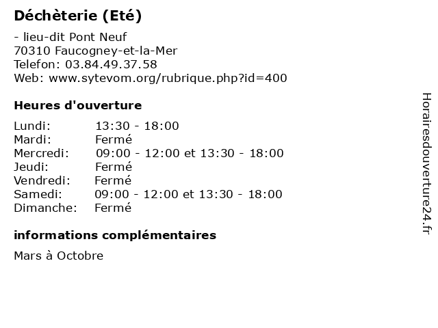 1 Déchèterie (Eté) (Distance: 6,56 km) - lieu-dit Ruisseau Jannot, 70270 Ternuay-Melay-et-Saint-Hilaire bennes, débarras, déchèterie, détritus, eté, ordures, poubelles, été 2 Déchèterie (Eté) (Distance: 9,61 km) - Chemin du Sygle, 70270 Mélisey bennes, débarras, déchèterie, détritus, eté, ordures, poubelles, été 3 Déchèterie (Eté) (Distance: 13,38 km) - Rue Pierre Curie, 70300 Saint-Sauveur bennes, débarras, déchèterie, détritus, eté, ordures, poubelles, été 4 Déchèterie (Eté) (Distance: 13,78 km) - Zone industrielle de la Germenain, 70220 Fougerolles bennes, débarras, déchèterie, détritus, eté, ordures, poubelles, été 5 Déchèterie (Eté) (Distance: 18,01 km) - zi des Cloyes, 70200 Lure bennes, débarras, déchèterie, détritus, eté, ordures, poubelles, été 6 Déchèterie (Hiver) (Distance: 0,00 km) - lieu-dit Pont Neuf, 70310 Faucogney-et-la-Mer bennes, débarras, déchèterie, détritus, hiver, ordures, poubelles |