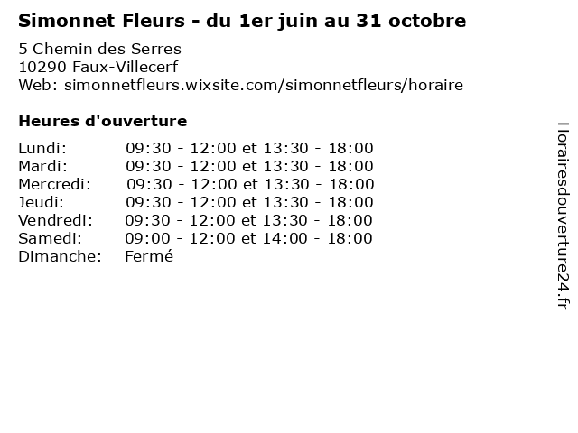 | Mercredi | 09:30-12:00 et 13:30-18:00 |