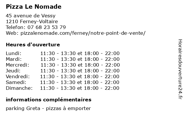 | Mercredi | 11:30-13:30 et 18:00-22:00 |