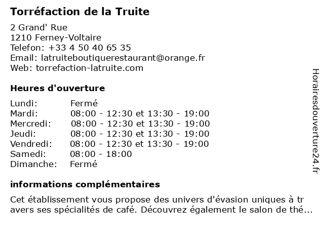 1 Hôtel Restaurant De La Truite (Distance: 11,39 km) 203 Grande Rue, 01220 Divonne-les-Bains de, hôtel, la, restaurant, truite 2 Oyo Torréfaction (Distance: 35,08 km) 22 Avenue Jean Jaurès, 01100 Oyonnax café, la, oyo, torre, torré, torréfacteur, torréfaction |