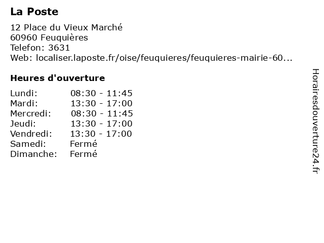 1 La Poste (Distance: 3,24 km) 1 Rue de Picardie, 60220 Moliens agence postale, courrier postal, expédition internationale, la, poste 3 La Poste (Distance: 7,87 km) 19 Rue Principale, 60220 Abancourt agence postale, courrier postal, expédition internationale, la, poste 5 La Poste (Distance: 11,00 km) 47 Place de la Halle, 60380 Songeons agence postale, courrier postal, expédition internationale, la, poste 6 La Poste (Distance: 11,48 km) 1 Bis Rue Philéas Lebesgue, 60690 Marseille-en-Beauvaisis express chronopost, la, poste, réexpédition internationale |