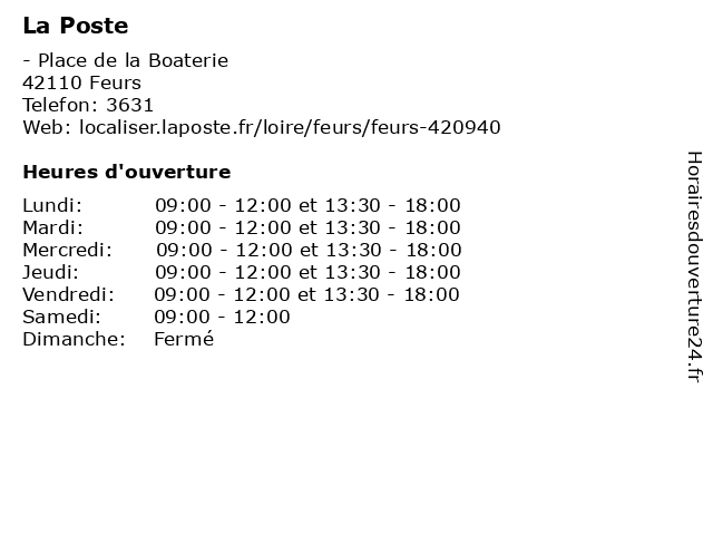 2 La Poste (Distance: 10,56 km) 2 Grande Rue, 42510 Neronde agence, assurance, banque, banque postale, bureau de poste, chronopost, colis, courrier, dps, expéditions internationales, la, point, postale, poste, relais, timbres, téléphonie, ups, western union 3 La Poste (Distance: 11,27 km) - Rue Philibert Gary, 42210 Montrond-les-Bains agence, assurance, banque, banque postale, bureau de poste, chronopost, colis, courrier, dps, expéditions internationales, la, point, postale, poste, relais, timbres, téléphonie, ups, western union 5 La Poste (Distance: 12,20 km) 272 Avenue des Farges, 42210 Bellegarde-en-Forez agence, assurance, banque, banque postale, bureau de poste, chronopost, colis, courrier, dps, expéditions internationales, la, point, postale, poste, relais, timbres, téléphonie, ups, western union 6 La Poste (Distance: 13,71 km) 261 Grande Rue, 69610 Haute-Rivoire agence postale, courrier postal, expédition internationale, la, poste |