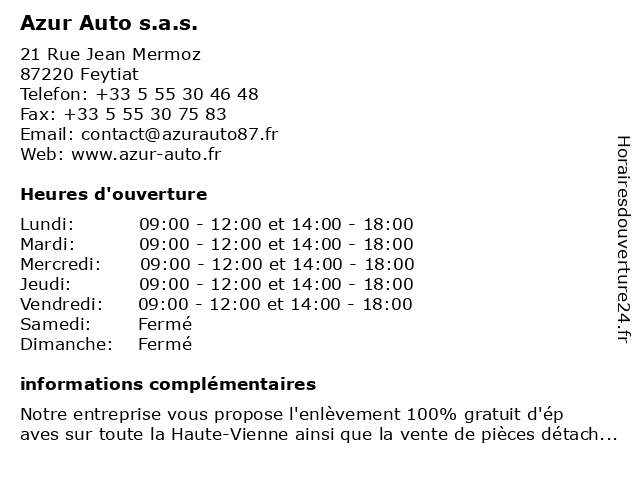 2 Hôtel Azur Saint Junien Citotel (Distance: 29,89 km) 10 Rue Evariste Galois, 87200 Saint-Junien azur, citotel, hôtel, junien, saint 3 Suzuki - Sarl Pascal Pericaud - Espace Commercial / Espace Occasions (Distance: 0,58 km) n/a route d'Eymoutiers, 87220 Feytiat auto, auto dealer, car, commercial, espace, occasions, parts, pascal, pericaud, sarl, services, suzuki 4 Suzuki - Sarl Pascal Pericaud - Service Après-Vente / Magasin (Distance: 0,58 km) n/a route d'Eymoutiers, 87220 Feytiat après, auto, auto dealer, car, magasin, parts, pascal, pericaud, sarl, service, services, suzuki, vente 5 Auto Ecole Française (Distance: 1,18 km) . Allée d'Italie, 87220 Feytiat auto, boite, code, conduite, ecole, embrayage, française, manuelle, panneaux, route, signalisation 6 Drivalia - Mobility Store (Distance: 1,29 km) 2 Rue Amédée Bollée, 87000 Limoges auto, drivalia, location, mobility, store, utilitaire, véhicule |