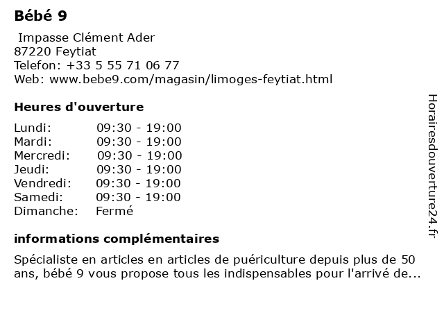 1 Les Trésors de Bébé (Distance: 3,59 km) 12 Rue des Soeurs de la Rivière, 87000 Limoges bébé, de, dépôt, les, magasin de vêtements pour enfants, mode., trésors, vente, vêtements pour bébés 3 Besson Chaussures (Distance: 0,93 km) 345 Route de Toulouse, 87000 Limoges besson, bébé, chaussures, entretien, femme, homme, maroquinerie 4 New Baby (Distance: 4,17 km) 8 Rue Fourie, 87000 Limoges baby, ecoutes bébé, mode, new, sommeil, voyage 5 Kids & Co (Distance: 4,36 km) 45 rue Jean Jaurès, 87000 Limoges boutique, bébé, chaussures, co, enfants, kids 6 Sergent Major (Distance: 4,49 km) . Route de Toulouse, 87220 Boisseuil accessoires, bébé, enfant, enfants, major, mode, sergent, vêtements |