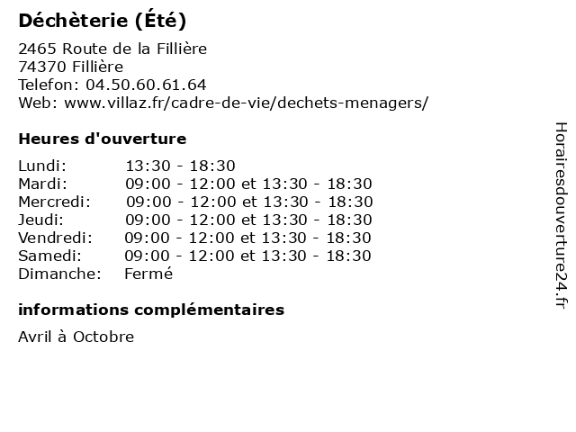 1 Déchèterie (Été) (Distance: 7,63 km) - Route des Moulins, 74350 Cruseilles bennes, déchets, déchèterie, détritus, gravats, été 2 Déchèterie (Été) (Distance: 14,53 km) - Chemin des Fillinges, 74160 Neydens bennes, déchets, déchèterie, détritus, gravats, été 3 Déchèterie (Été) (Distance: 15,04 km) - Impasse du Môle, 74800 La Roche-sur-Foron bennes, déchets, déchèterie, détritus, gravats, été 4 Déchèterie (Été) (Distance: 16,75 km) 704 route des Marais, 74410 Saint-Jorioz 01/04, 30/09, au, du, déchèterie, gravats, huiles usées, la réception des déchets et écocentres, les appareils électroménagers, les déchets verts, papier et carton en quantité, été 5 Glaces des Alpes - été (Distance: 3,50 km) 191 Avenue des marais, 74350 Allonzier la caille allonzier la caille, alpes, des, en, glaces, glacier, été 6 Piscine Jean Régis à Annecy - Vacances scolaires (hors vacances d'été) (Distance: 7,71 km) 90 chemin des Fins, 74000 Annecy annecy, baignade, d'été, hors, jean, natation, piscine, régis, scolaires, sports nautiques, vacances |