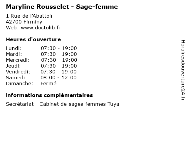1 Maryline Giraud Gestion-MGG (Distance: 14,62 km) Rue de la Chazotte, 42350 La Talaudière gestion, giraud, maryline, mgg 2 Claire Grail - Sage-femme (Distance: 0,00 km) 1 Rue de l'Abattoir, 42700 Firminy claire, du, femme, grail, maternité, périnée, rééducation, sage, uro-gynécologique 3 Isabelle Marmagne - Sage-femme (Distance: 0,00 km) 1 Rue de l'Abattoir, 42700 Firminy du, femme, isabelle, marmagne, maternité, périnée, rééducation, sage, uro-gynécologique 4 Clarisse Merle Scalzo - Sage-femme (Distance: 0,00 km) 1 Rue de l'Abattoir, 42700 Firminy clarisse, du, femme, maternité, merle, périnée, rééducation, sage, scalzo, uro-gynécologique 5 Hôpital Le Corbusier - Maternité (Distance: 0,72 km) 2 Rue Robert Ploton, 42704 Firminy bureau, consultation, corbusier, dr, hôpital, le, maladie, maternité, med, médecin, médecine, pratique, thérapie, traitement 6 Marlène Vialla - Sage-femme - secrétariat (Distance: 8,57 km) 36 Rue du Onze Novembre, 42100 Saint-Étienne diagnostic, echographie, femme, marlène, maternité, sage, sage-femme, secrétariat, vialla |