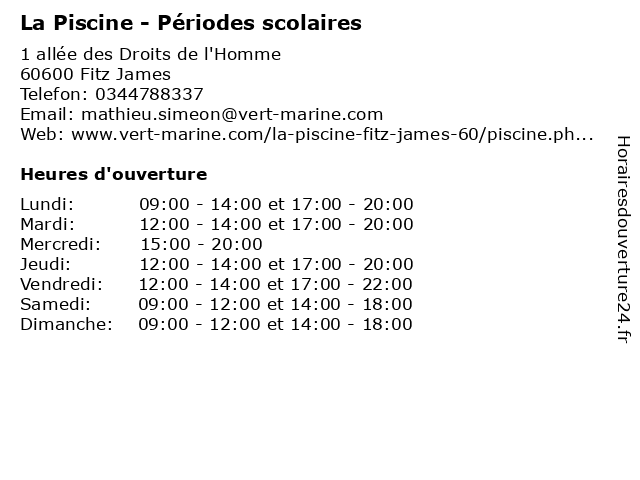 1 La Piscine - bien-être, l'espace fitness (Petites vacances) (Distance: 0,00 km) 1 allée des Droits de l'Homme, 60600 Fitz James aqua, aquatique, bien, fitness, l'espace, la, petites, piscine, vacances, être 2 La Piscine - bien-être, l'espace fitness (Grandes vacances) (Distance: 0,00 km) 1 allée des Droits de l'Homme, 60600 Fitz James aqua, aquatique, bien, fitness, grandes, l'espace, la, piscine, vacances, être 3 Piscine de la Vallée dorée - périodes scolaires (Distance: 8,83 km) 2 avenue du Général de Gaulle, 60140 Liancourt aqua, aquatique, de, dorée, la, piscine, périodes, scolaires, vallée 4 Mondial Piscine - PBL (Distance: 11,91 km) - Rue Joseph Arnal, 60510 Bresles beton, exterieur, interieur, mondial, pbl, picine, piscine 5 Bibliothèque-Médiathèque - vacances scolaires (Distance: 12,73 km) 71 rue du Général Leclerc, 60250 Balagny sur Therain bibliothèque, cd audio, cd.rom, livres, médiathèque, revues, scolaires, vacances 6 Bibliothèque Elsa Triolet - Hors vacances scolaires (Distance: 14,99 km) 92 Avenue Anatole France, 60160 Montataire bibliothèque, cd audio, cd.rom, elsa, hors, livres, revues, scolaires, triolet, vacances |