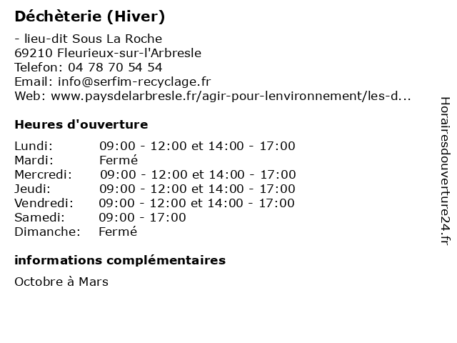 1 Déchèterie (Hiver) (Distance: 6,20 km) - Route de Saint Antoine, 69380 Chazay-d'Azergues bennes, déchets, déchèterie, détritus, gravats, hiver 2 Déchèterie (Hiver) (Distance: 9,89 km) - impasse des Anciennes Vignes, 69410 Champagne-au-Mont-d'Or bennes, débarras, déchèterie, détritus, hiver, mars, novembre, ordures, poubelles 3 Déchèterie (Hiver) (Distance: 11,02 km) 2 avenue Louis Pradel, 69290 Saint-Genis-les-Ollières bennes, débarras, déchèterie, détritus, hiver, mars, novembre, ordures, poubelles 4 Déchèterie (Hiver) (Distance: 13,23 km) 82 avenue Sidoine Appolinaire, 69000 Lyon bennes, débarras, déchèterie, détritus, hiver, mars, novembre, ordures, poubelles 5 Déchèterie (Hiver) (Distance: 13,31 km) - Avenue Lossburg, 69480 Anse bennes, déchets, déchèterie, détritus, gravats, hiver 6 Déchèterie (Hiver) (Distance: 13,54 km) - Avenue des Frères Lumière, 69250 Neuville-sur-Saône bennes, débarras, déchèterie, détritus, hiver, mars, novembre, ordures, poubelles |