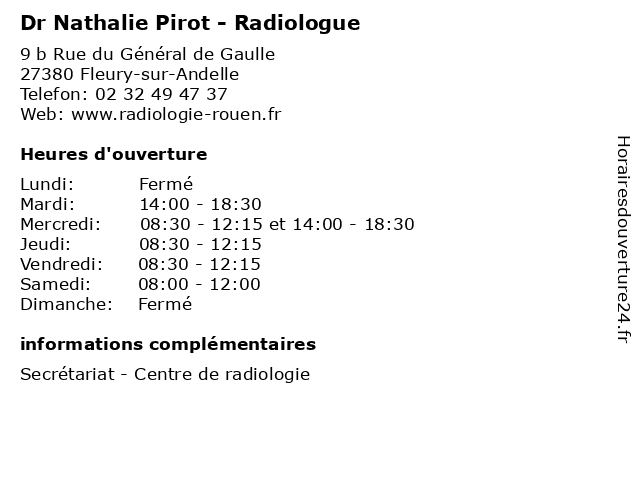 1 Dr Nathalie Pirot - Radiologue (Distance: 15,71 km) 9 rue d’Anjou, 76240 Le Mesnil-Esnard consultation, docteur, dr, med, médecin, médecine, nathalie, pirot, radiologue, traitement 2 Dr Nathalie Bogliolo - Médecin généraliste (Distance: 17,46 km) 23E Route de Paris, 76240 Bonsecours bogliolo, consultation, docteur, dr, généraliste, med, médecin, médecine, nathalie, secrétariat, traitement 3 Dr. Nathalie Carteron - Dentiste (Distance: 18,31 km) 37 Rue Jean Jaures, 76410 Tourville-la-Rivière carteron, dentiste, docteur, dr., medecins, nathalie, sante 4 Madame Nathalie Duboc - Médecine générale (Consultation sur rendez-vous) (Distance: 18,84 km) 20 rue soeur Marie-Ernestine, 76000 Rouen consultation, docteur, duboc, générale, madame, medecins, médecine, nathalie, rendez, santé, sur, vous 5 Nathalie Martin - Réflexologue (Distance: 18,92 km) 46A Rue Jean Jacques Rousseau, 76350 Oissel kiné, kinésithérapeute, martin, nathalie, réflexologue, rééducation, soin 6 Nathalie Remillier - Sage-femme (Distance: 19,54 km) 37 Boulevard Gambetta, 76031 Rouen accouchement, echographie, femme, nathalie, obstétrique, remillier, sage, secretariat, secrétariat |