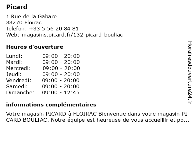 Votre magasin PICARD à FLOIRAC Bienvenue dans votre magasin PICARD BOULIAC. Notre équipe est heureuse de vous accueillir et pourra vous conseiller avec professionnalisme et en toute simplicité. ...