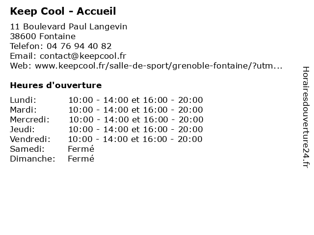 1 Keep Cool - Accueil (Distance: 2,73 km) 2 chemin du Néron, 38360 Sassenage accueil, coach, cool, de, diet, fitness, keep, l’equip’cool, musculation, remise en forme, sport 2 Keep Cool (Accès à la Salle) (Distance: 0,00 km) 11 Boulevard Paul Langevin, 38600 Fontaine accès, biking, cardiotraining, cool, d'ouverture, horaires, keep, la, musculation, salle, salles de gym 3 Caisse Primaire D'Assurance Maladie (Accueil téléphonique) (Distance: 0,81 km) 2 Rue du Centre, 38600 Fontaine accueil, administration, assoc, caisse, d'assurance, maladie, primaire, services, services publics, téléphonique 4 Caisse Primaire D'Assurance Maladie (Accueil téléphonique) (Distance: 2,62 km) 92-94 Cours de la Libération, 38000 Grenoble accueil, administration, assoc, caisse, d'assurance, maladie, primaire, services, services publics, téléphonique 5 Keep Cool (Accès à la Salle) (Distance: 2,73 km) 2 chemin du Néron, 38360 Sassenage accès, biking, cardiotraining, cool, d'ouverture, horaires, keep, la, musculation, salle, salles de gym 6 Keep Cool (Distance: 3,15 km) 58-60 Boulevard Gambetta, 38000 Grenoble accès, biking, cardiotraining, cool, d'ouverture, horaires, keep, la, musculation, salle, salles de gym |