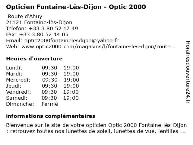 1 Audioprothésiste Fontaine Les Dijon - Audio 2000 (Distance: 0,01 km) 9001 Route dAhuy, 21121 Fontaine-lès-Dijon 2000, aide auditive, appareil auditif, audio, audio 2000, audioprothésiste, audition, dijon, fontaine, les 3 Optic 2000 (Distance: 0,33 km) . Pré Potets, 21121 Fontaine- Les-Dijon 2000, cafe, enfants.chaussures, lingerie, mode hemmes, mode homme, optic, restaurant 4 Opticien DIJON - AHUY Optical Center (Distance: 0,41 km) Rue des Grandes Varennes, 21121 Ahuy ahuy, center, dijon, optical, opticien 5 Atol Mon Opticien (Distance: 1,57 km) Centre Commercial La Toison Dor, 21000 Dijon atol, atol les opticiens, atol mon opticien, lentilles, lunettes de soleil, lunettes de vue, mon, opticien, opticien dijon 6 Opticien DIJON TOISON D'OR GrandOptical (Distance: 1,63 km) Avenue de Langres, 21000 Dijon d'or, dijon, examen de la vue, grandoptical, lentilles de contact, lentilles progressives, lunette ray ban, lunettes, lunettes anti-lumière bleue, lunettes de conduite de nuit, lunettes de conduites de nuit, lunettes de soleil, lunettes de soleil pour enfant, lunettes de soleil pour femme, lunettes de soleil pour homme, lunettes de vue, lunettes de vue femme, lunettes de vue homme, lunettes progressives, opticien, opticien proche de chez moi, optique, sport à la vue, toison, vérification de la vue |