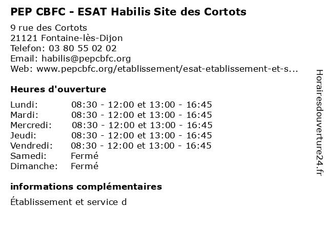 1 PEP CBFC - Point d’accès numériques Baudelaire (Distance: 1,31 km) 25 avenue Charles Baudelaire, 21000 DIJON accompagnement, aides, baudelaire, cbfc, d’accès, numériques, pep, point, social, socio-éducatif, équipe, établissements 2 PEP CBFC - Accueil de Loisirs Périscolaire (Distance: 1,37 km) 31 rue des Marronniers, 21121 Ahuy accompagnement, accueil, aides, cbfc, de, loisirs, pep, périscolaire, social, socio-éducatif, équipe, établissements 3 PEP CBFC - Château de Pouilly (Distance: 1,89 km) 1 rue Edouard Manet, 21000 Dijon accompagnement, aides, cbfc, château, de, pep, pouilly, social, socio-éducatif, équipe, établissements 4 PEP CBFC - HDJ Pédopsychiatrique Les Cigognes (Distance: 2,27 km) 26 rue Elsa Triolet, 21000 Dijon accompagnement, aides, cbfc, cigognes, hdj, les, pep, pédopsychiatrique, social, socio-éducatif, équipe, établissements 5 PEP CBFC - Centre d’accueil Familial spécialisé (CAFS) (Distance: 2,35 km) 30 B rue Elsa Triolet, 21000 Dijon accompagnement, aides, cafs, cbfc, centre, d’accueil, familial, pep, social, socio-éducatif, spécialisé, équipe, établissements 6 PEP CBFC - La Solidarité en Action (Distance: 2,42 km) 30b Rue Elsa Triolet, 21000 Dijon action, association, cbfc, en, la, les, organisation, pep, société, solidaire, solidarité |