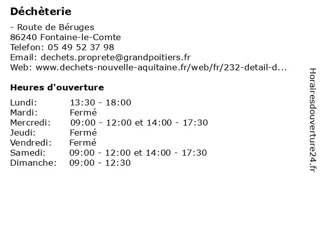 1 Déchèterie (Distance: 6,10 km) - route de Chênebrault, 86240 Iteuil benne, débarras, déchets, déchèterie, détritus 2 Déchèterie (Distance: 7,37 km) - Chemin de la Rangonnière, 86240 Smarves déchèterie, gravats, huiles usées, la réception des déchets et écocentres, les appareils électroménagers, les déchets verts, papier et carton en quantité 3 Déchèterie (Distance: 9,05 km) - Route de Parthenay, 86440 Migné-Auxances déchèterie, gravats, huiles usées, la réception des déchets et écocentres, les appareils électroménagers, les déchets verts, papier et carton en quantité 4 Déchèterie (Distance: 9,63 km) - Champs Demoiselle, 86470 Montreuil-Bonnin cartons, déchets, déchèterie, gravats 5 Déchèterie (Distance: 10,00 km) - Route de Bonneuil Matours, 86000 Poitiers déchèterie, gravats, huiles usées, la réception des déchets et écocentres, les appareils électroménagers, les déchets verts, papier et carton en quantité 6 Déchèterie (Distance: 11,76 km) - Fontjoise, 86340 Aslonnes déchèterie, gravats, huiles usées, la réception des déchets et écocentres, les appareils électroménagers, les déchets verts, papier et carton en quantité |