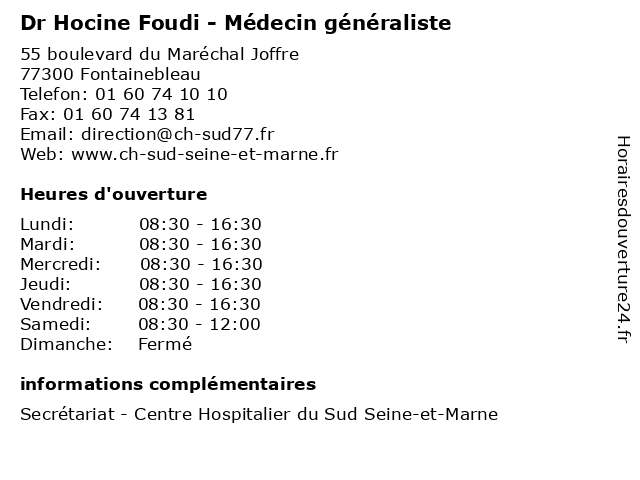 1 Dr Hocine Foudi - Médecin généraliste (Distance: 16,64 km) 270 avenue Marc Jacquet, 77000 Melun consultation, docteur, dr, foudi, généraliste, hocine, med, médecin, traitement 2 Dr Hocine Bensaadi - Chirurgien viscéral et digestif (Distance: 0,00 km) 55 Boulevard du Maréchal Joffre, 77300 Fontainebleau bariatrique, bensaadi, ch, chirurgie, chirurgien, digestif, digestive, dr, du, endocrinienne, et, fontainebleau, hocine, marne, seine, sud, viscéral 3 Dr Lahcene Foudi - Médecin généraliste (Distance: 0,00 km) 55 boulevard du Maréchal Joffre, 77300 Fontainebleau consultation, docteur, dr, foudi, généraliste, lahcene, med, médecin, traitement 4 Dr. Mimoune Hocine - Rhumatologue (Distance: 19,18 km) 2 Rue Du Marechal Juin, 77130 Montereau Fault Yonne docteur, dr., hocine, medecins, mimoune, rhumatologue, sante 5 Dr Majid Si Hocine - Spécialiste en médecine interne - secrétariat (Distance: 48,55 km) 2 Rue des Pères Camilliens, 94360 Bry-sur-Marne consultation, docteur, dr, en, hocine, interne, majid, med, médecin, médecine, secrétariat, si, spécialiste, traitement 6 |