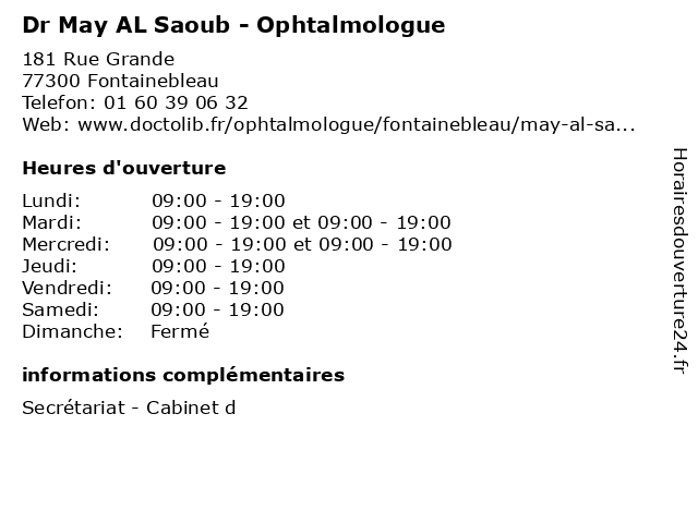 1 Dr May Al Saoub - Ophtalmologue (Distance: 0,87 km) 181 Rue Grande, 77300 Fontainebleau al, consultation, docteur, dr, may, médecins, ophtalmologie, ophtalmologue, rendez, santé, saoub, sur, vous 2 Dr Sylvie Nedey - Ophtalmologue (Distance: 0,55 km) 37 Rue d'Avon, 77300 Fontainebleau dr, nedey, ophtalmologie, ophtalmologistes, ophtalmologue, sylvie, vision 3 Dr Odile Brochier Vangheluwe - Ophtalmologue (Distance: 0,57 km) 19 Rue le Notre, 77300 Fontainebleau brochier, dr, odile, ophtalmologie, ophtalmologistes, ophtalmologue, vangheluwe, vision 4 Antiquités Thierry May (Distance: 0,59 km) 213 Rue Saint-Merry, 77300 Fontainebleau antiquités, may, thierry 5 Anne Laure Jaffrelo - Al Amma (Distance: 2,07 km) 3 Rue Jacques Durand, 77210 Avon al, amma, anne, jaffrelo, laure 6 Dr Ramez Al Zin - Chirurgien-dentiste (Distance: 5,58 km) 44 Rue Sadi Carnot,, 77810 Thomery al, chirurgien, dent, dentiste, docteur, dr, ramez, soins, zin |