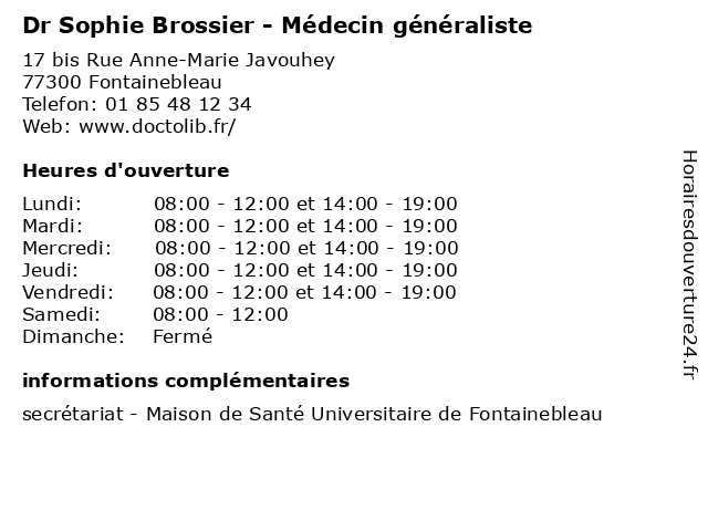 | Lundi | 08:00-12:00 et 14:00-19:00 |
