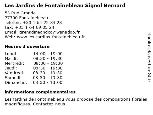 1 Maître Bernard Dumont - Avocat (Distance: 0,20 km) 34 Rue Grande, 77300 Fontainebleau avocat, avocate, avocats, bernard, civils, droits, dumont, juridiques, maître 2 Château de Fontainebleau - Les cours et jardins - De novembre à février (Distance: 0,43 km) - Rue Denecourt, 77300 Fontainebleau ancien, art, chateau, château, cours, de, et, exposition, fontainebleau, février, histoire, jardins, les, livre, monument, musee, musée, novembre, office 3 Château de Fontainebleau - Les cours et jardins - En mars, avril et octobre (Distance: 0,43 km) - Rue Denecourt, 77300 Fontainebleau ancien, art, avril, chateau, château, cours, de, en, et, exposition, fontainebleau, histoire, jardins, les, livre, mars, monument, musee, musée, octobre 4 Château de Fontainebleau - Les cours et jardins - De mai à septembre (Distance: 0,43 km) - Rue Denecourt, 77300 Fontainebleau ancien, art, chateau, château, cours, de, et, exposition, fontainebleau, histoire, jardins, les, livre, mai, monument, musee, musée, office, septembre 5 Résidence Les Jardins de Sedna - Sedna (Distance: 1,42 km) 2 Rue Père Maurice, 77210 Avon de, ephad, jardins, les, maison, residence, retraite, résidence, sedna 6 Daniel Moquet signe vos jardins - Ent. C.Foucaut (Distance: 12,16 km) 20 Rue des Champs, 77140 Moncourt-Fromonville c.foucaut, création, crédit d'impôt, daniel, daniel moquet jardins, daniel moquet paysagiste, débroussaillage, désherbage, engazonnement, ent., entreprise entretien jardin, entretien, espaces verts, gazon de placage, jardinier, jardins, massif paysager, moquet, nettoyage, paysagiste, paysagiste jardin, signe, taille, taille de haies, tonte de pelouse, vos |