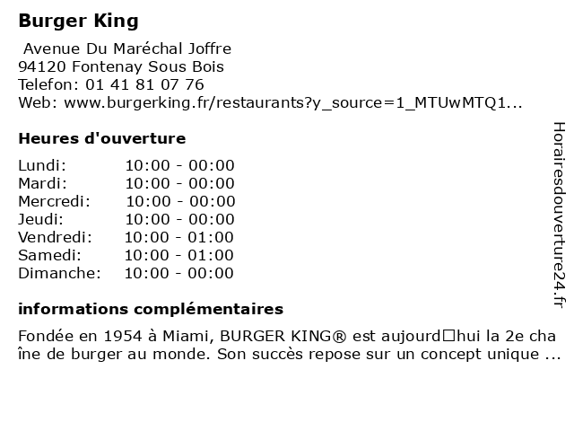 1 Burger King (Distance: 2,31 km) . Avenue du Général de Gaulle, 93117 Rosny-sous-Bois breakfast, burger, fastfood, king, restaurant 2 Burger King (Distance: 6,05 km) 279 Avenue Daumesnil, 75012 Paris bar & gril, burger, king, restaurant américain, restaurant de hamburgers, restaurant familial, restaurant à emporter 3 Burger King (Distance: 6,38 km) 4 Avenue Du Trône, 75012 Paris bar & gril, burger, king, restaurant américain, restaurant de hamburgers, restaurant familial, restaurant à emporter 4 Burger King (Distance: 8,29 km) 79-81 Quai De La Gare, 75013 Paris bar & gril, burger, king, restaurant américain, restaurant de hamburgers, restaurant familial, restaurant à emporter 5 Burger King (Distance: 8,30 km) 20 Rue De La Roquette, 75011 Paris bar & gril, burger, king, restaurant américain, restaurant de hamburgers, restaurant familial, restaurant à emporter 6 Burger King (Distance: 8,45 km) 30 Avenue Corentin Cariou, 75019 Paris bar & gril, burger, king, restaurant américain, restaurant de hamburgers, restaurant familial, restaurant à emporter |