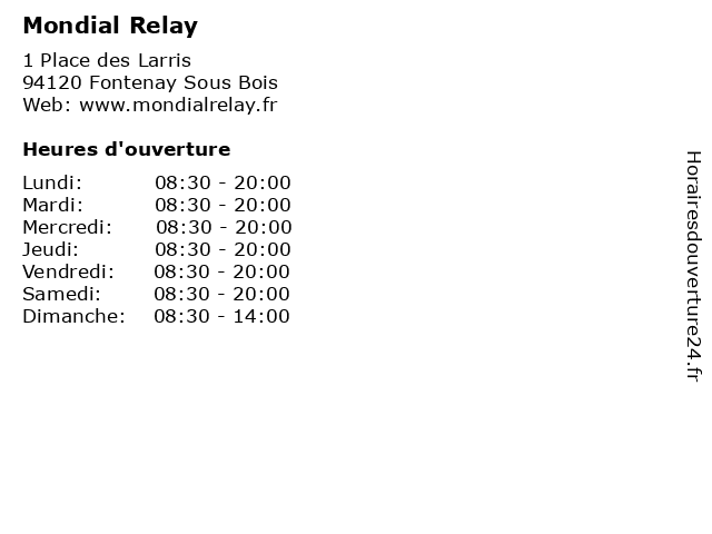1 Mondial Relay (Distance: 0,64 km) 50 Boulevard de Verdun, 94120 Fontenay Sous Bois assurances, banques, mondial, mondial relay, relay, services 2 Mondial Relay (Distance: 0,66 km) - Avenue du Maréchal Joffre, 94120 Fontenay Sous Bois assurances, banques, mondial, mondial relay, relay, services 3 Mondial Relay (Distance: 1,00 km) 38 Rue Roger Salengro, 94120 Fontenay Sous Bois assurances, banques, mondial, mondial relay, relay, services 4 Mondial Relay (Distance: 3,99 km) 7 Avenue General Gallieni, 94340 Joinville Le Pont assurances, banques, mondial, mondial relay, relay, services 5 Mondial Relay (Distance: 5,72 km) 56 Rue du Rendez-Vous, 75012 Paris assurances, banques, mondial, mondial relay, relay, services 6 Mondial Relay (Distance: 5,95 km) 7 Rue de Tahiti, 75012 Paris assurances, banques, mondial, mondial relay, relay, services |