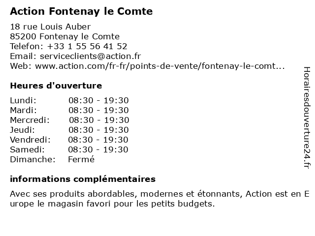 1 Analyse & Action - FONTENAY-LE-COMTE (Distance: 0,27 km) 68 Boulevard des Champs Marots, 85200 Fontenay-le-Comte action, analyse, comte, fontenay, le 2 Centre Communal d'Action Sociale - CCAS (Distance: 1,63 km) 12 Rue des Cordeliers, 85200 Fontenay-le-Comte action, ccas, centre, communal, d'action, sociale 3 Action Luçon (Distance: 26,54 km) Chemin des Roches, 85400 Luçon action, animaux domestiques, articles de sport, articles ménagers, boissons & alimentation, bricolage, cuisine, habitat, hobby, hygiène & beauté, jardin, jouets, luçon, mode, multimédia, papeterie & bureau, voyages 4 Action Niort (Distance: 32,67 km) 11 Rue Robert Turgot, 79000 Niort action, animaux domestiques, articles de sport, articles ménagers, boissons & alimentation, bricolage, cuisine, habitat, hobby, hygiène & beauté, jardin, jouets, mode, multimédia, niort, papeterie & bureau, voyages 5 Action Chantonnay (Distance: 33,60 km) Avenue Monseigneur Batiot, 85110 Chantonnay action, animaux domestiques, articles de sport, articles ménagers, boissons & alimentation, bricolage, chantonnay, cuisine, habitat, hobby, hygiène & beauté, jardin, jouets, mode, multimédia, papeterie & bureau, voyages 6 Action La Rochelle - Puilboreau (Distance: 38,40 km) Rue du 18 Juin, 17138 Puilboreau action, animaux domestiques, articles de sport, articles ménagers, boissons & alimentation, bricolage, cuisine, habitat, hobby, hygiène & beauté, jardin, jouets, la, mode, multimédia, papeterie & bureau, puilboreau, rochelle, voyages |