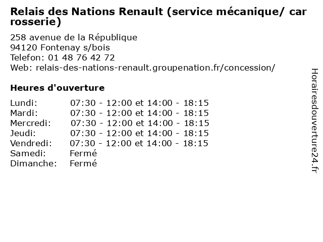 1 Relais des Nations Renault (service commercial) (Distance: 0,00 km) 258 avenue de la République, 94120 Fontenay s/bois commercial, des, nations, relais, renault, service, services, véhicules 2 Relais des Nations Renault (magasin pièces et accesoires) (Distance: 0,00 km) 258 avenue de la republique, 94120 Fontenay s/bois accesoires, des, et, magasin, nations, pieces, pièces, relais, renault, services, véhicules 3 Renault Rent Garage de la Mairie (Distance: 2,33 km) 25 Boulevard Paul Vaillant Couturier, 93100 Montreuil de, garage, la, mairie, renault, rent 4 Garage Hoel - Renault (Distance: 2,92 km) 44 Avenue de Bry, 94170 Le Perreux sur Marne entretien, garage, hoel, neuves, occasion, renault, réparation, vente, voitures 5 Renault Retail Group (Vente Vehicule Neuf Z.E.) (Distance: 3,68 km) 57 Route Armand Carrel, 93100 Montreuil automobiles, garage, group, motos - concessionnaire, neuf, renault, retail, vehicule, vente, z.e. 6 Renault Retail Group (Atelier Mecanique) (Distance: 3,68 km) 57 Route Armand Carrel, 93100 Montreuil atelier, automobiles, garage, group, mecanique, motos - concessionnaire, renault, retail |