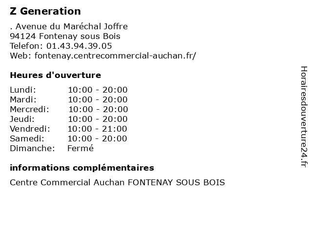 1 Z Generation (Distance: 1,19 km) , Val de Fontenay, 94120 Fontenay Sous Bois accessories, children 0-14 years, clothing, coats, dresses, generation, hoodies, jackets, jeans pants, pajamas, shirts, shoes, skirts, sweatshirts, t-shirts 2 Z Generation (Distance: 2,57 km) 28, rue du Midi, 94300 Vincennes accessories, children 0-14 years, clothing, coats, dresses, generation, hoodies, jackets, jeans pants, pajamas, shirts, shoes, skirts, sweatshirts, t-shirts 3 Z Generation (Distance: 3,10 km) . Avenue du Général-de-Gaulle, 93117 Rosny-Sous-Bois beaute, cafe, chaussures, enfants, generation, hommes, lingerie, mode femmes, restaurant, sport 4 Z Generation (Distance: 3,60 km) , C.C. C251, 94360 Bry Sur Marne accessories, children 0-14 years, clothing, coats, dresses, generation, hoodies, jackets, jeans pants, pajamas, shirts, shoes, skirts, sweatshirts, t-shirts 5 Z Generation (Distance: 7,93 km) 1, avenue Secrétan, 75019 Paris accessories, children 0-14 years, clothing, coats, dresses, generation, hoodies, jackets, jeans pants, pajamas, shirts, shoes, skirts, sweatshirts, t-shirts 6 Z Generation (Distance: 8,63 km) , Rue de Dunkerque, 75571 Paris accessories, children 0-14 years, clothing, coats, dresses, generation, hoodies, jackets, jeans pants, pajamas, shirts, shoes, skirts, sweatshirts, t-shirts |