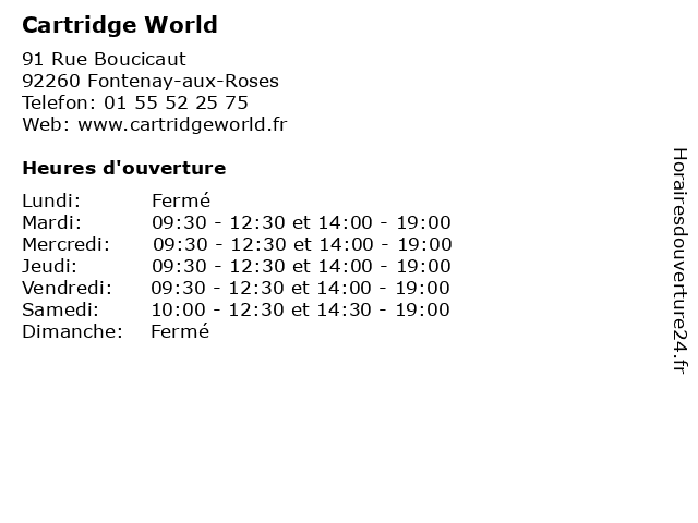 1 Cartridge World (Distance: 5,22 km) 272 Rue Lecourbe, 75015 Paris cartridge, fax, fournitures de bureau, photocopieur, world 2 Cartridge World (Distance: 5,50 km) 35 Rue Raymond Losserand, 75014 Paris cartridge, fax, fournitures de bureau, photocopieur, world 3 Cartridge World (Distance: 5,93 km) 3 Rue Thiers, 92100 Boulogne-Billancourt cartridge, fax, fournitures de bureau, photocopieur, world 4 Cartridge World (Distance: 8,25 km) 71 Boulevard de Brandebourg, 94200 Ivry-sur-Seine brother, cartouche, cartridge, encre, imprimante, world 5 Cartridge World (Distance: 9,90 km) 43 Rue du Rocher, 75008 Paris cartridge, fax, fournitures de bureau, photocopieur, world 6 Cartridge World (Distance: 10,52 km) 45 Avenue de la République, 75011 Paris cartridge, fax, fournitures de bureau, photocopieur, world |