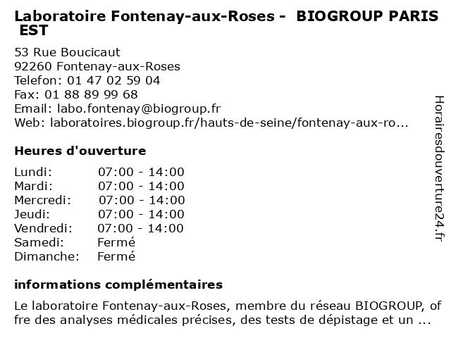 Termes de recherche pour Laboratoire Fontenay-aux-Roses - BIOGROUP PARIS EST:fontenay, aux, paris, laboratoire, est, roses, biogroup, dépistages, laboratoire de diagnostic |