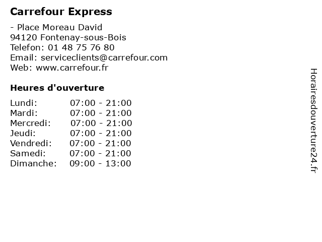 1 Carrefour Express (Distance: 0,61 km) 7 Rue Notre-Dame, 94120 Fontenay-sous-Bois alimentaire, alimentation, carrefour, courses, distributeur, express, hypermarché, supermarché, épicerie 2 Carrefour Express (Distance: 4,15 km) 1 Avenue de la République, 92170 Vanves alimentation, carrefour, express, magasin discount, market, supermarché 3 Carrefour Express (Distance: 4,37 km) 10-12 Rue du Rendez-Vous, 75012 Paris alimentation, carrefour, express, magasin discount, market, supermarché 4 Carrefour Express (Distance: 4,53 km) 44 Rue Sibuet, 75012 Paris alimentation, carrefour, express, magasin discount, market, supermarché 5 Carrefour Express (Distance: 5,40 km) 122-124 Avenue Gambetta, 75020 Paris alimentation, carrefour, express, magasin discount, market, supermarché 6 Carrefour Express (Distance: 5,79 km) 100 Boulevard Diderot, 75012 Paris alimentation, carrefour, express, magasin discount, market, supermarché |
