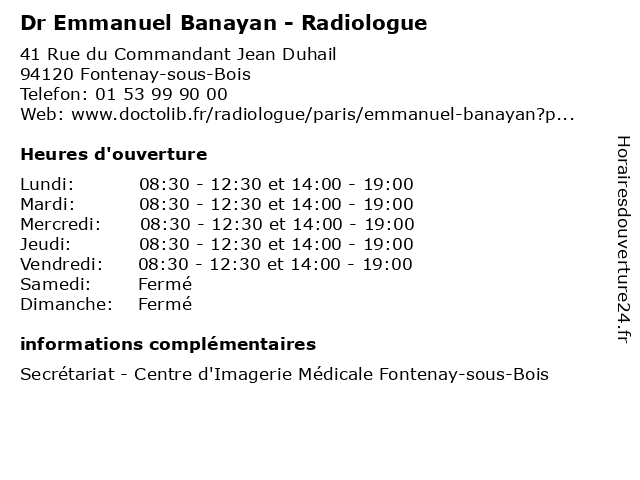 1 Dr Emmanuel Banayan - Radiologue (Distance: 2,62 km) 3 Avenue Jean Jaurès, 94340 Joinville-le-Pont banayan, consultation, docteur, dr, emmanuel, med, médecin, radiologue, traitement 2 Dr Emmanuel Banayan - Radiologue (Distance: 3,89 km) 50 Boulevard de la Boissière, 93100 Montreuil banayan, consultation, docteur, dr, emmanuel, med, médecin, médecine, radiologue, traitement 3 Dr Emmanuel Banayan - Radiologue (Distance: 4,04 km) 3 Rue Fernand Foureau, 75012 Paris banayan, docteur, dr, emmanuel, médecine, radiologie, radiologue 4 Dr Emmanuel Banayan - Radiologue (Distance: 5,57 km) 9 Quai de Bercy, 94220 Charenton-le-Pont banayan, bercy, clinique, de, diagnostique, dr, emmanuel, imagerie, radiologie, radiologue, service, thérapeutique 5 Dr Emmanuel Banayan - Radiologue (Distance: 7,25 km) 104 Avenue Parmentier, 75011 Paris banayan, dr, emmanuel, médecin, médecine, médical, pharmaceutique, radiologue, secretariat, secrétariat, traitement 6 Dr Emmanuel Banayan - Radiologue (Distance: 7,89 km) 85 Route de Provins, 94490 Ormesson-sur-Marne banayan, dr, emmanuel, médecin, médecine, médical, pharmaceutique, radiologue, secretariat, traitement |